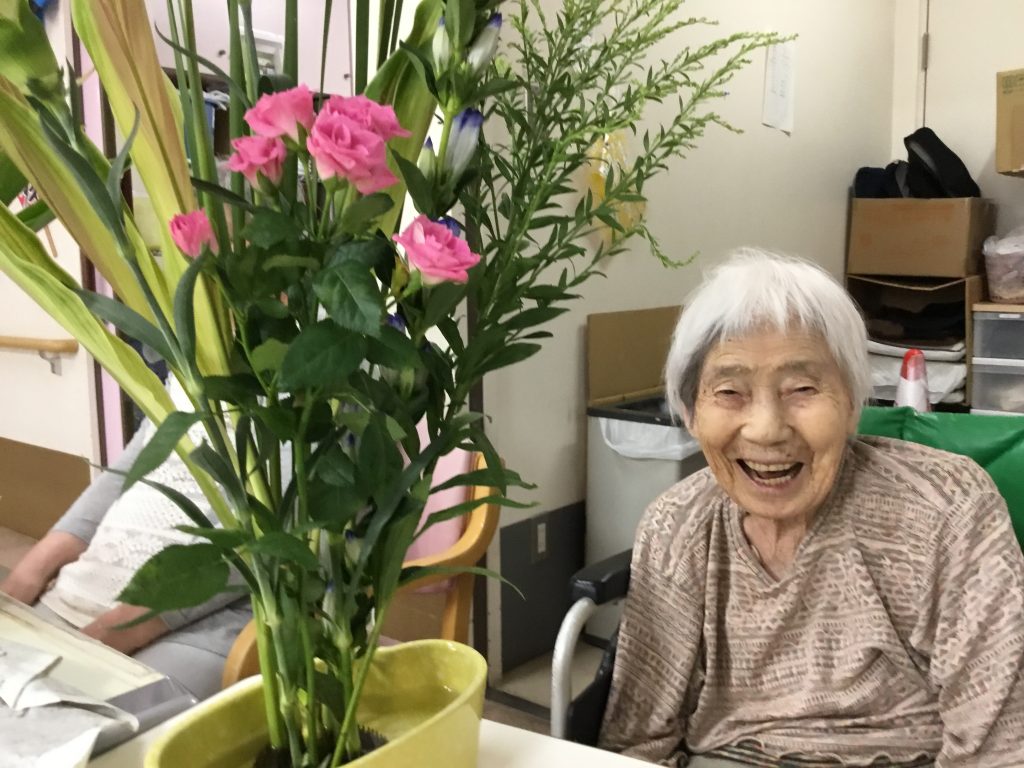 午前中はフロアにて数字パズルや、指の訓練で小豆掴みをされ過ごされました。 とても真剣にされておられます。 職員が飲み物をお渡しすると「美味しい」と言われ全部飲んでくださいました。 午後より華道をされました。お花を生けられる際に「これは難しい...