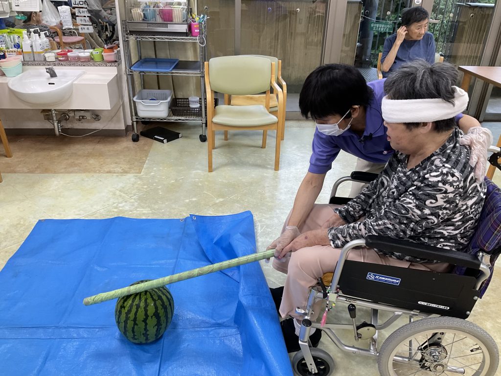 本日は4階のフロア企画にて「スイカ割り」を行いました。夏と言えばスイカ割り!と言う方も少なくはないのでしょうか?1回ではなかなか割ることは出来ませんでしたが2回目で皆様スイカを無事に割られました。冷たくて甘いスイカのお味はどうでしょうか... -
