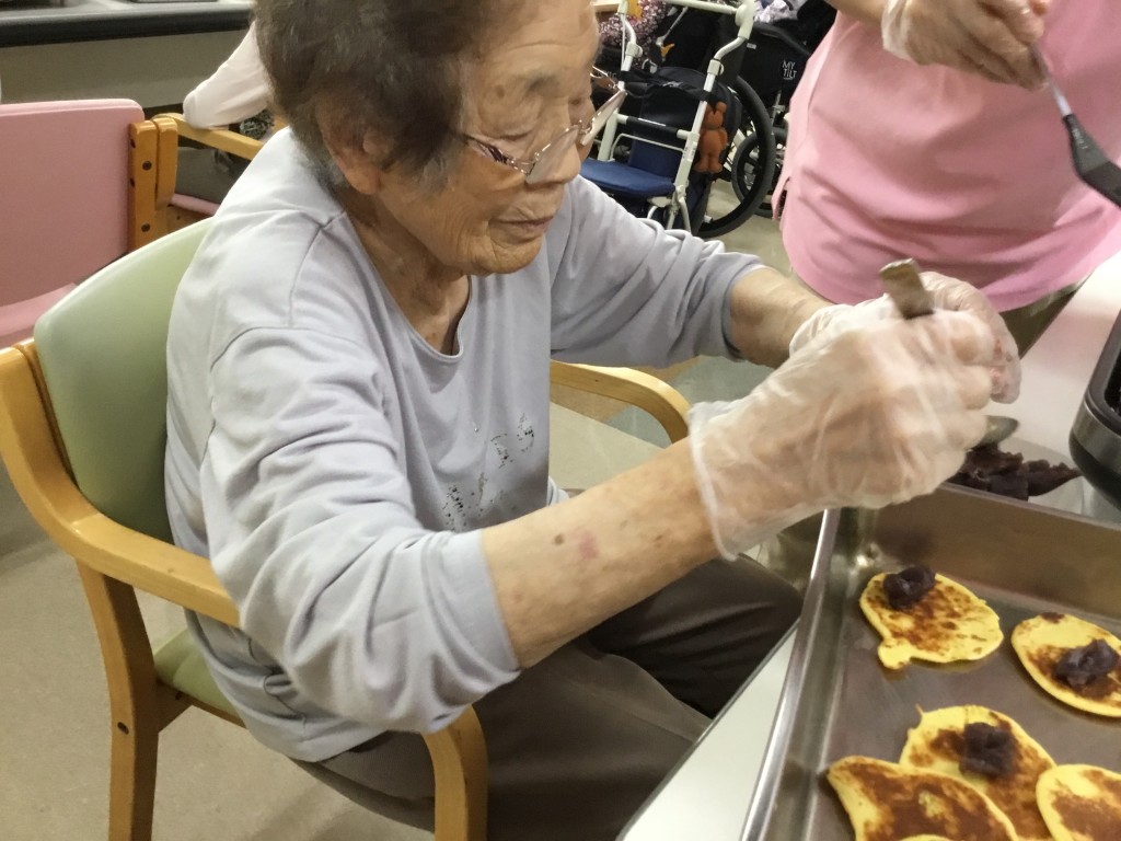本日おやつ時どら焼きづくりをしました。皆様「あまくておいしいね」と言ってくださいました。