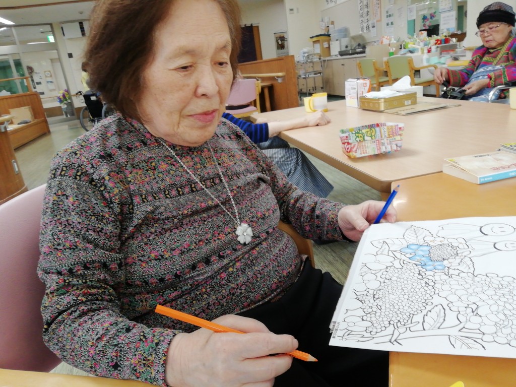本日は快晴で、暑い日となりました。 お散歩に行って来たり、リハビリをしたり、塗り絵を楽しんだりと思い思いに過ごされました。 -