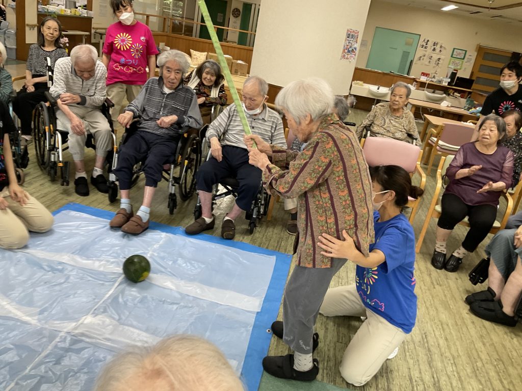 本日、3階で夏祭りが開催されました。 皆様大変喜ばれていました。特にスイカ割りでは、中々割る事ができず、笑顔で交代しながら頑張りました。何回めかでやっと割る事ができ、「おー」と拍手喝采でした。 屋台の出し物は、たこ焼き、焼きそば、つくね串、... -