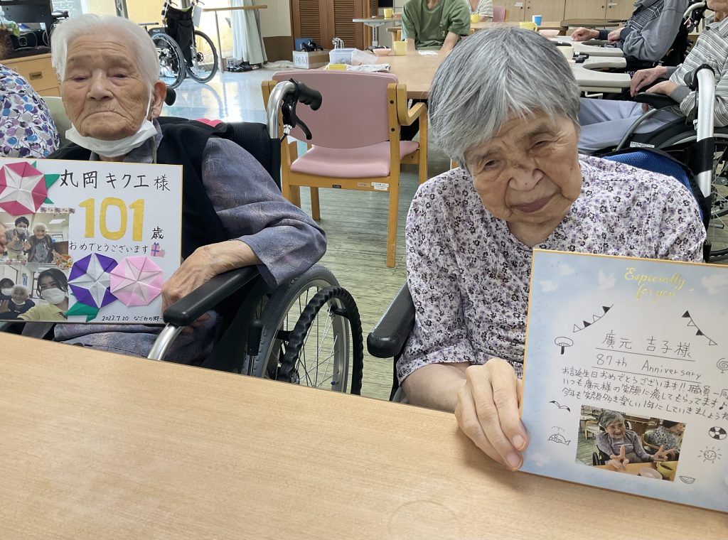 皆様1日お疲れ様でした! 本日は、M様とH様のお誕生日だった為、ホールでお祝いをしました。 その後、ケーキを美味しそうに一個ペロリと食べられました。喜んで頂けて何よりです。 これからも元気に楽しく過ごしていきましょうね! -