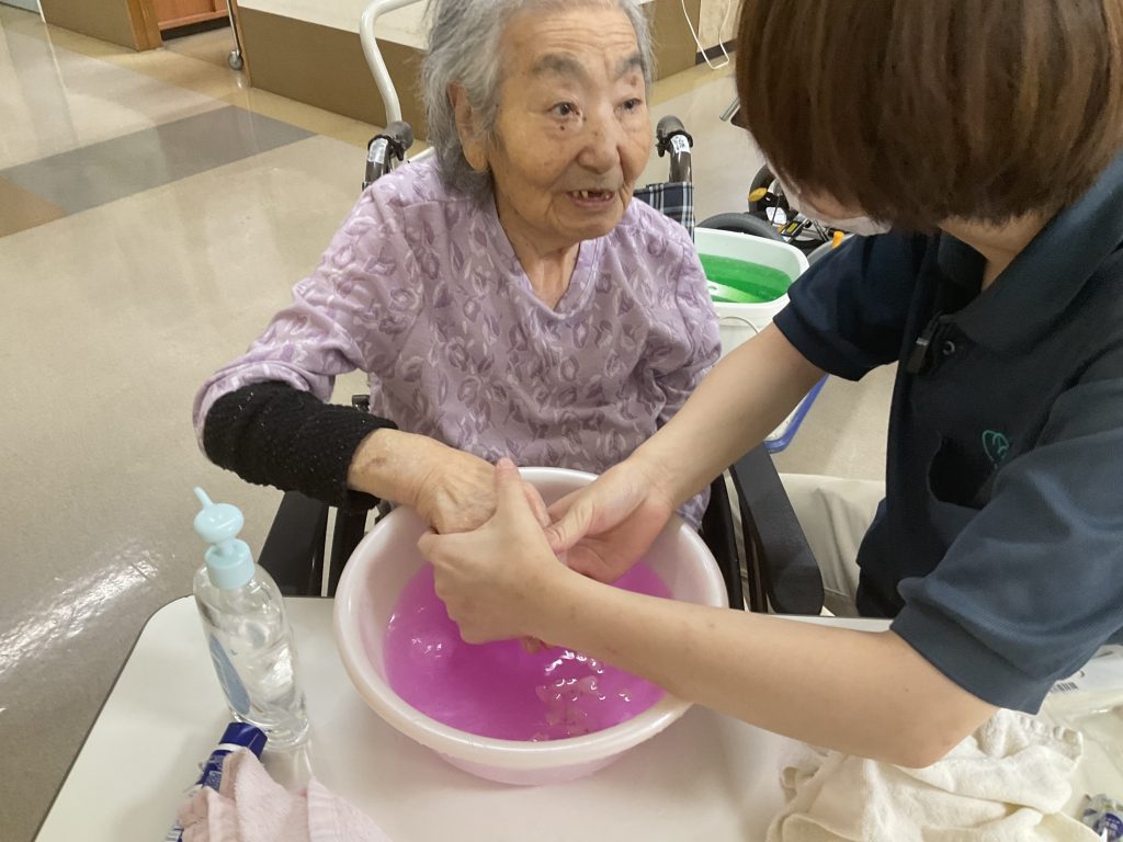 本日はリラクゼーションとして数名の利用者様に足湯や手浴をしていただきました。 皆様穏やかな表情をしておられました。 本日もお変わりなく過ごされました。 -