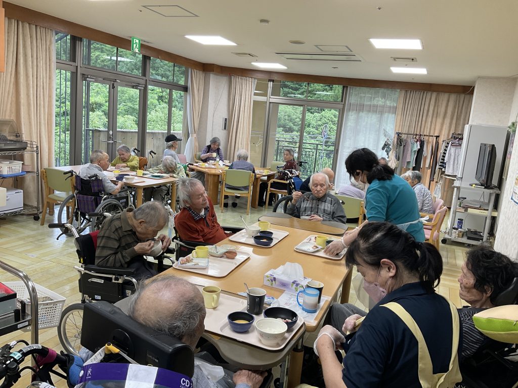 本日の夕食の時間のご様子です。 入所者様お一人ずつ状態に合わせたお食事を提供しております。 和やかな雰囲気で召し上がられております -