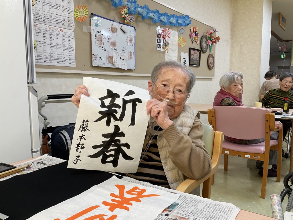 新年あけましておめでとうございます。本年もよろしくお願いします。 本日の昼食はお節料理でした。皆様大変喜ばれておられました。午後からは書初めをしていただきお正月の雰囲気を楽しまれていました。 -