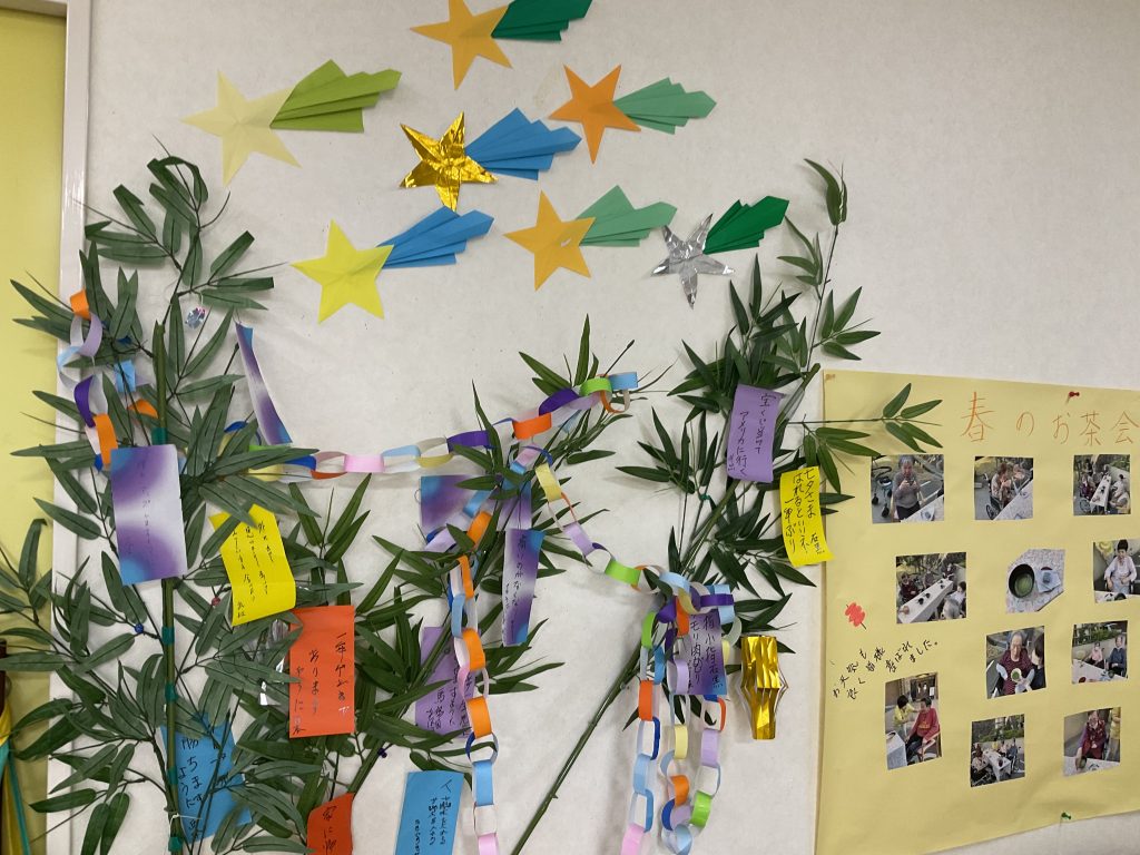 本日は七夕ですね、4階では流れ星を折り紙で作りました。とってもキレイにできて嬉しいです。みんなで協力して作りました。 -