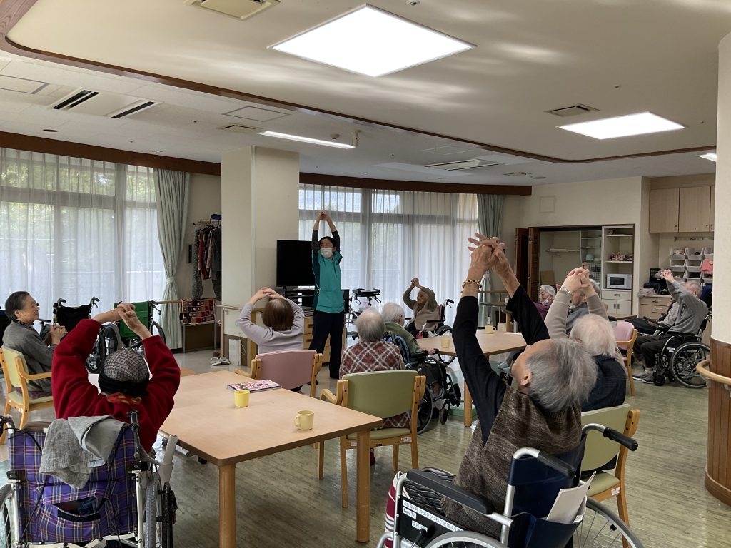 秋晴れの心地よいお天気の中、5階は体操しました。 来週は運動会も開催するので皆さましっかりと体をほぐされていらっしゃいました。 -