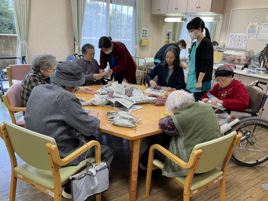 本日は焼き芋大会がありました🍠 下準備としてさつま芋を包むのを手伝ってくださいました。 午後からは焼き芋をいただきました。 皆様「懐かしいね」「よく食べとったよ」「美味しそうじゃね」と言われておりました。 また、パズルをされたり職員腕相撲をさ... -