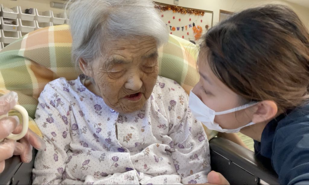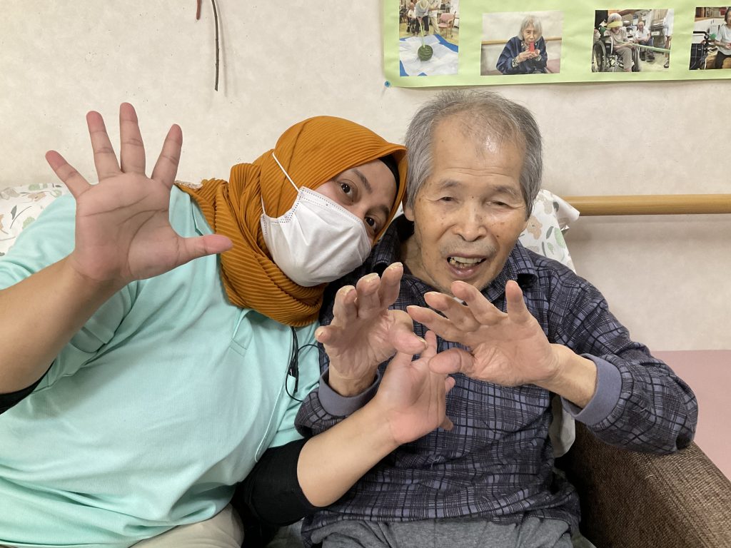 本日も、洗濯物を畳んでくださり、職員のお手伝いをして下さいました。 カメラを向けると笑顔でピースして下さいました。 -