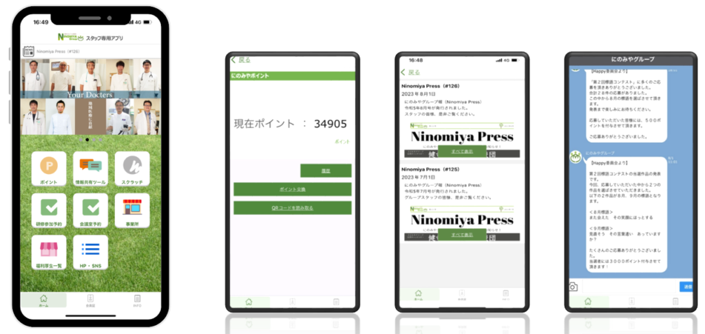 入社した職員は、にのみやグループスタッフ専用アプリをインストールしてポイント管理と情報共有を行います。